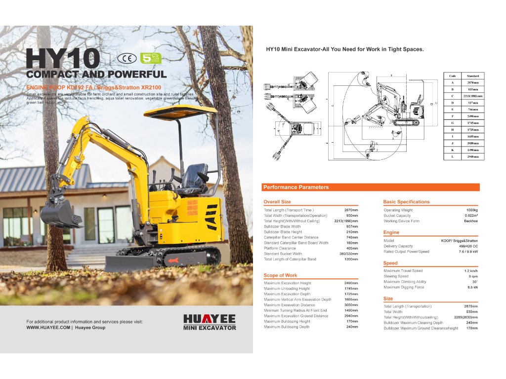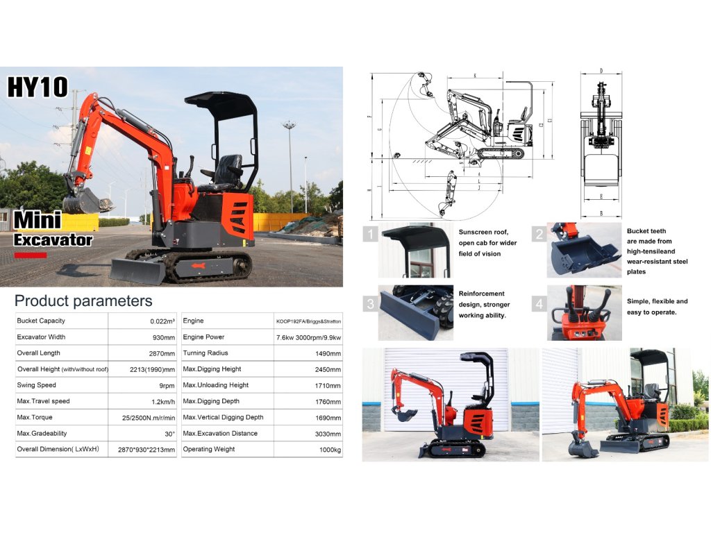 Flexibilné a výkonné HY10 je mini model rýpadla, je vhodný na prácu vo vonkajšom prostredí, na rôzne úpravy pozemkov, záhrad a pod.
